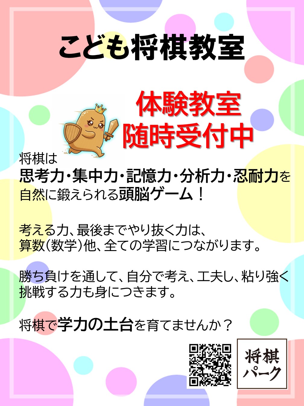 将棋を通じて、「思考力」「集中力」「記憶力」「分析力」「忍耐力」が自然と身につきます。