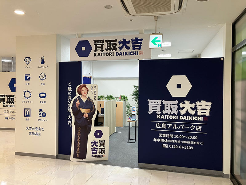 青い看板が目印の買取大吉 広島アルパーク店へ是非お越しください。