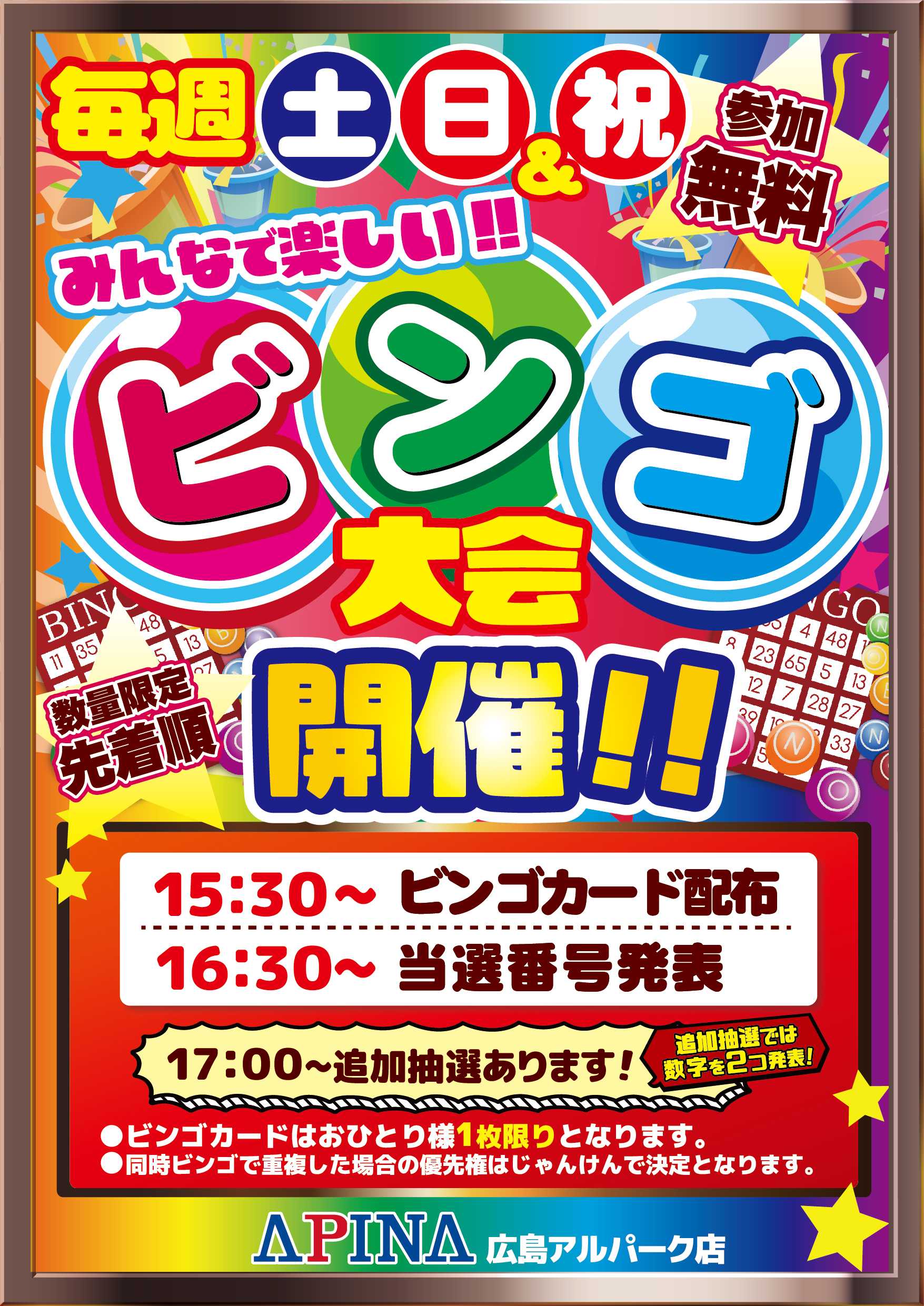 毎週土・日曜&祝日はビンゴ大会開催!