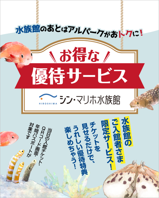 アルパークでは、シン・マリホ水族館のご入館者さま限定で、とってもお得な優待サービスを実施しています♪